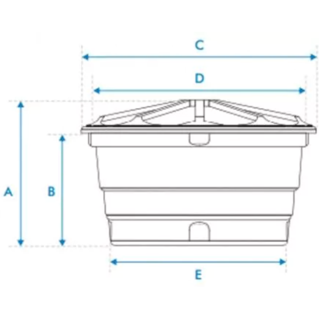 | Capacidade | Altura c/ Tampa (A) | Altura s/ Tampa (B) | Diâmetro c/ Tampa (C) | Diâmetro s/ Tampa (D) | Diâmetro da Base (E) |